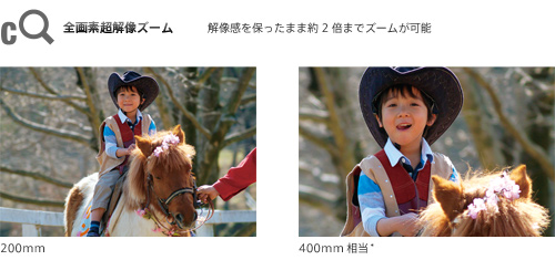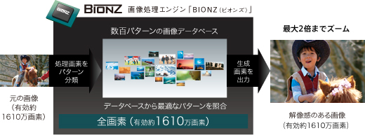 「全画素超解像技術」は、写真を構成しているすべての画素を解析し、写真の解像感を向上させるソニーの独自技術です。この技術を利用することで有効約1610万画素の最大画素数のまま、解像感を維持しつつ、「オートポートレートフレーミング」による切り出しや、最大2倍相当の「全画素超解像ズーム」を実現しています。