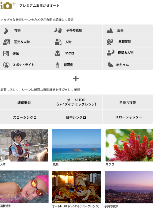 「人物」や「マクロ」「夜景」など12種類の撮影シーンをカメラが自動で見分けて、絞りやシャッタースピードなどを最適な設定に調整。さらに認識したシーンに応じて、最適な撮影機能を自動的に呼び出して撮影する「プレミアムおまかせオート」。高速で動く被写体には「連続撮影」、逆光時では「オートHDR(ハイダイナミックレンジ)」、夜景では「手持ち夜景」モードなど、高度な撮影機能を簡単に使いこなせます。たとえば「連続撮影」では、連写後にピントの合っている画像を自動抽出するなど、カメラまかせで最適な1枚を撮影できます。