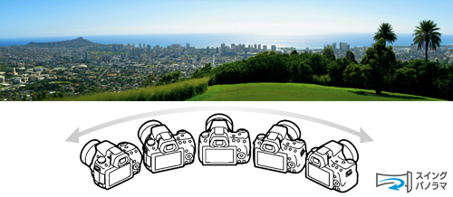 カメラを一振りするだけでパノラマ写真を撮影できる「スイングパノラマ」機能を搭載。シャッターボタンを押してカメラを一振りする間に自動的に高速連写し、1枚のJPEG画像につなぎ合わせます。いままで画面に収まり切らなかった広大な風景や構造物も、1枚のパノラマ写真にできます。