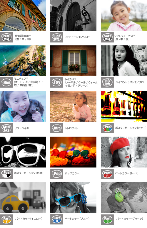 個性的な作品づくりが楽しめる「ピクチャーエフェクト」機能を搭載。「絵画調HDR(*)」「リッチトーンモノクロ(*)」「ソフトフォーカス(*)」「ミニチュア(*)」をはじめ、「トイカメラ」「ハイコントラストモノクロ」「ソフトハイキー」「レトロフォト」「ポスタリゼーション(カラー、白黒)」「ポップカラー」「パートカラー(ブルー、レッド、グリーン、イエロー)」まで全15種類のエフェクトを使って印象的な作品を撮影できます。パソコンで画像加工しなくても、カメラの設定でさまざまな作品をつくれます。また、静止画だけでなく、動画でもエフェクトを使った映像作品を撮影できます。