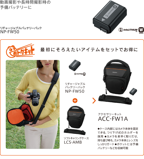 旅行や運動会、イベントなどの動画撮影や長時間の撮影では欠かせない予備バッテリーをご用意。また、専用ケースやストラップなど予備バッテリーと一緒に最初にそろえておきたいアイテムをセットにしたお得なキットもご用意しました。