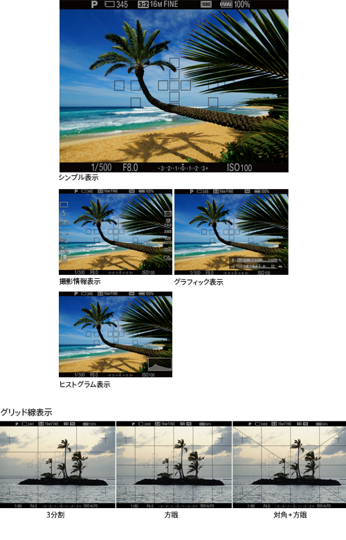 有効約144万ドット相当の「トゥルーファインダー」の高い解像度を生かした4種類の画面表示を用意。撮影情報を一覧できる「撮影情報表示」をはじめ、シャッタースピードと絞りの変化による効果の違いをイラストでわかりやすく表示する「グラフィック表示」、さらに3種のグリッドラインなどをファインダーに表示可能。ファインダーから目を離すことなくカメラの設定操作が行えます。また、4種類のファインダー表示を切り替えられるだけでなく、自分の好みに応じて表示する画面を選択できます。