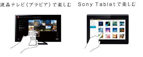 液晶テレビ〈ブラビア〉では、〈ブラビア〉ネットフォト内にαcafeコーナーを設置(*1)。αcafeの作品を大画面で鑑賞できます。またSony Tabletでは、「ネットフォトフレーム by Life-X(*2)」にαcafeコーナーを設置(*1)。αcafeの作品をタブレットならではのユーザーインターフェースで楽しめます。