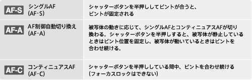 • ※ 「連続撮影優先AE」モードは、連続撮影を優先するため、「コンティニュアスAF(AF-C)」時に絞りはF3.5、開放絞りがF3.5以上のレンズでは開放値に制御されます