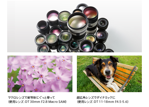 個性の異なるレンズを使って表現を変えられるのが、レンズ交換式カメラの魅力です。広角レンズで風景をダイナミックにとらえたり、マクロレンズで小さな被写体に迫ったり。豊富なαレンズ(Aマウントレンズ)を装着すれば、快適なAF性能(*)を生かしながら映像表現の領域を今まで以上に広げます。