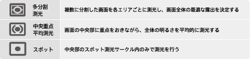CMOSセンサーがとらえた画像を1200分割し、被写体の色や光の状況を細かく分析して高精度な測光を行います。測光モードは、各エリアの測光データをもとに適正な露出を決める「多分割測光」。知識や経験が活かせる「中央重点平均測光」、狙った部分だけを測光する「スポット測光」から、好みやシーンに合わせて選択できます。