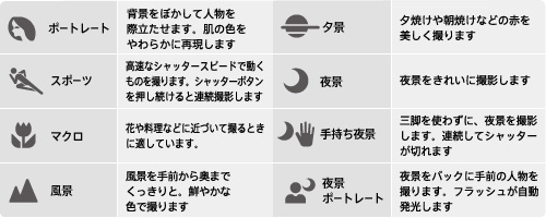 撮りたいシーンに合わせてモードを選ぶだけで、カメラが自動的に絞りやシャッタースピード、ホワイトバランスなどを設定します。「ポートレート」「風景」「マクロ」「スポーツ」「夕景」「夜景ポートレート」「夜景」「手持ち夜景」の8種類のモードから選択できます。