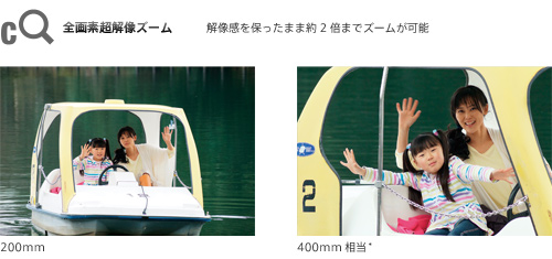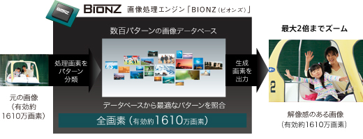 「全画素超解像技術」は、写真を構成しているすべての画素を解析し、写真の解像感を向上させるソニーの独自技術です。この技術を利用することで有効約1610万画素の最大画素数のまま、解像感を維持しつつ、「オートポートレートフレーミング」による切り出しや、最大2倍相当の「全画素超解像ズーム」を実現しています。