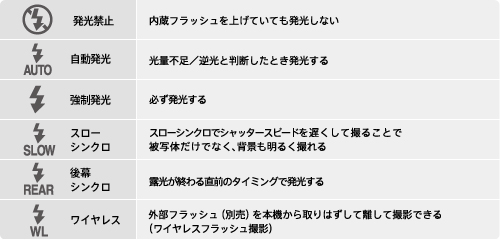 カメラが明るさを判断して自動的にポップアップする内蔵フラッシュを搭載。暗い場所だけでなく、人物の表情が暗くなりがちな逆光シーンでも自動で発光し、表情を鮮やかに撮影できます。照射角は18mmレンズまでの画角をカバーし、発光量はガイドナンバー10(*)です。フラッシュモードは、「自動発光」のほか、雰囲気のある夜景ポートレートが撮れる「スローシンクロ」、動きの軌跡を表現できる「後幕シンクロ」や、「強制発光」「赤目軽減発光」など多彩なフラッシュモードを搭載しています。