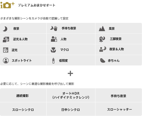 はじめてでも簡単に、キレイに撮影できるように、カメラ設定を自動で調整してくれる「おまかせオート」と、その場に適した高度な撮影機能を自動的に呼び出して撮影する「プレミアムおまかせオート」の2つのモードを搭載。さらに撮りたいシーンに合わせてモードを選べる「シーンセレクション」や、撮るのが難しい夜景も簡単に撮れる「手持ち夜景」モードなど撮影機能が充実しています。