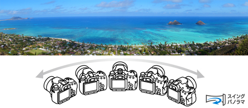 カメラを一振りするだけでパノラマ写真を撮影できる「スイングパノラマ」機能を搭載。シャッターボタンを押してカメラを一振りする間に自動的に高速連写し、1枚のJPEG画像につなぎ合わせます。いままで画面に収まり切らなかった広大な風景や構造物も、1枚のパノラマ写真にできます。