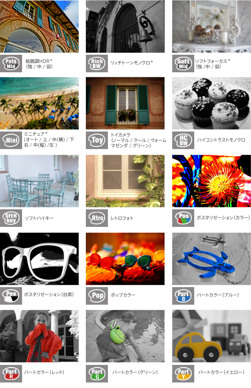 個性的な作品づくりが楽しめる「ピクチャーエフェクト」機能を搭載。「絵画調HDR(*)」「リッチトーンモノクロ(*)」「ソフトフォーカス(*)」「ミニチュア(*)」をはじめ、「トイカメラ」「ハイコントラストモノクロ」「ソフトハイキー」「レトロフォト」「ポスタリゼーション(カラー、白黒)」「ポップカラー」「パートカラー(ブルー、レッド、グリーン、イエロー)」まで全15種類のエフェクトを使って印象的な作品を撮影できます。パソコンで画像加工しなくても、カメラの設定でさまざまな作品をつくれます。また、静止画だけでなく、動画でもエフェクトを使った映像作品を撮影できます。
