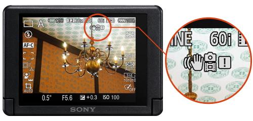 シャッタースピードや焦点距離から判断して手ブレが起こりそうなときには、液晶モニターとファインダー内に手ブレ警告を表示して、失敗を未然に防ぎます。