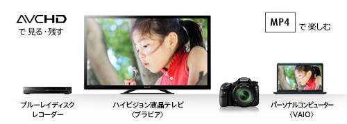 ソニーなら撮る楽しみだけでなく、撮ったあとの楽しさも充実。AVCHD方式で撮ったフルハイビジョン映像を、ハイビジョン液晶テレビとつなげて家族で鑑賞したり、ブルーレイディスクレコーダーでフルハイビジョン画質のまま保存したり。さらにMP4方式で撮ったハイビジョン映像なら、パソコンでの編集も簡単。ウェブにアップして手軽にみんなとシェアできます。“α”ならさまざまなAV機器と自由に連携して、ハイビジョン動画を思いのままに楽しめます。