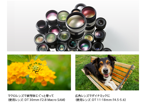 個性の異なるレンズを使って表現を変えられるのが、レンズ交換式カメラの魅力です。広角レンズで風景をダイナミックにとらえたり、マクロレンズで小さな被写体に迫ったり。豊富なαレンズ(Aマウントレンズ)を装着すれば、快適なAF機能(*)を生かしながら映像表現の領域を今まで以上に広げます。また、αはボディに手ブレ補正機能を搭載しているので、広角から望遠、マクロまで、すべてのαレンズ(Aマウントレンズ)(*)で手ブレを抑えながら美しい映像を撮影できます。