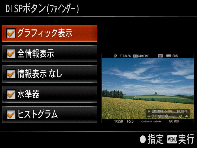有機ELファインダー「XGA OLED Tru-Finder(トゥルーファインダー)」の約235万ドット相当の高い解像度を生かした5種類の画面表示を用意。撮影情報を一覧できる「撮影情報表示」をはじめ、カメラの水平やアングルの傾きを確認できるデジタル水準器、さらに3種のグリッドラインなどをファインダーに表示可能。ファインダーから目を離すことなくカメラの設定操作が行えます。また、5種類のファインダー表示を切り替えられるだけでなく、自分の好みに応じて表示する画面を選択できます。
