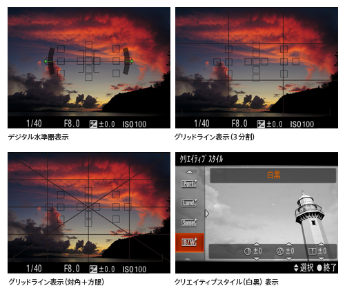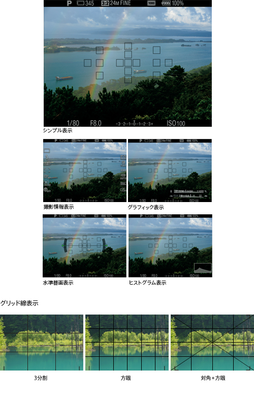 詳細撮影情報をはじめ、カメラの傾きをチェックできるデジタル水準器、構図決定に便利な3種のグリッドラインを液晶モニターに表示できます。カメラの設定からピント・構図の確認、撮影まで、ライブビュー映像を見ながらスムーズに実行できます。ファインダーと液晶モニターの切り替えは、専用ボタンのほか、アイセンサーによる自動切り替えも可能です。