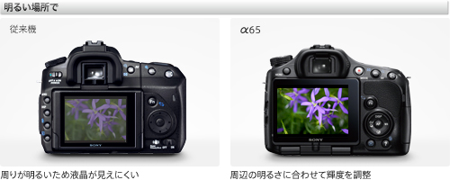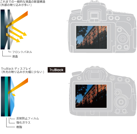 撮影環境に合わせて自動で液晶モニターの明るさを調整する「明るさセンサー」を内蔵。自動的に液晶のバックライトの輝度をアップし、視認性をさらに高めるダイナミックな画像表示を行います。「TruBlack(トゥルーブラック)」技術との組み合わせにより、光の反射や映りこみを減らし、よく晴れた日の屋外撮影も快適です。