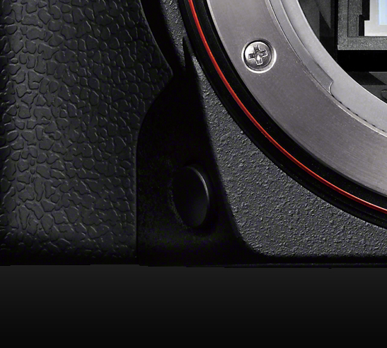 α77は、世界初の新開発3軸チルト液晶モニターを採用。ハイポジションやローポジションでの撮影はもとより、縦構図や横構図、三脚撮影など、どんな撮影スタイルでも無理なく撮影から画像確認までが行えるフレキシビリティーの高い可動式液晶モニターです。縦方向または横方向に開く2軸バリアングル液晶モニターと比較して、多くのポジションで光軸の中心付近に液晶モニターを配置できるので、違和感なく構図チェックなどが可能で、より自然かつ快適なライブビュー撮影を実現します。