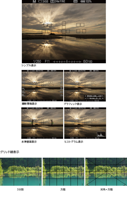 詳細撮影情報をはじめ、カメラの傾きをチェックできるデジタル水準器、構図決定に便利な3種のグリッドラインを液晶モニターに表示できます。カメラの設定からピント・構図の確認、撮影まで、ライブビュー映像を見ながらスムーズに実行できます。ファインダーと液晶モニターの切り替えは、専用ボタンのほか、アイセンサーによる自動切り替えも可能です。