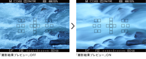 プレビューボタンを使えば、通常の設定絞り値の効果が確認できる「絞りプレビュー」に加えて、「撮影結果プレビュー」も可能。撮影前に背景のぼけ具合を確認できるだけでなく、シャッタースピード効果やDレンジオプティマイザー効果のイメージを反映して、被写界深度だけでなく動感表現までしっかりチェックできます。