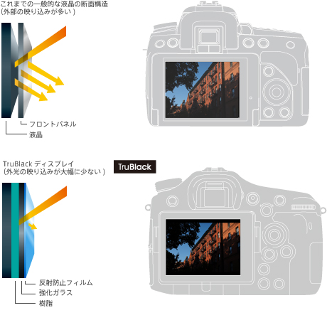 被写体を高精細に映し出し、厳密なピント確認が容易な約92.1万ドットの3.0型「エクストラファイン」液晶を搭載。「TruBlack(トゥルーブラック)ディスプレイ」やLEDバックライトの採用により、液晶表面の外光反射を抑制し、広い視野角を実現。あらゆるアングルからでも高い視認性を誇ります。また、高コントラストで深みのある黒を再現し、被写体の細部、微妙なグラデーションまで鮮明に表示します。液晶画面でのピント合わせや画像チェックも快適に行えます。