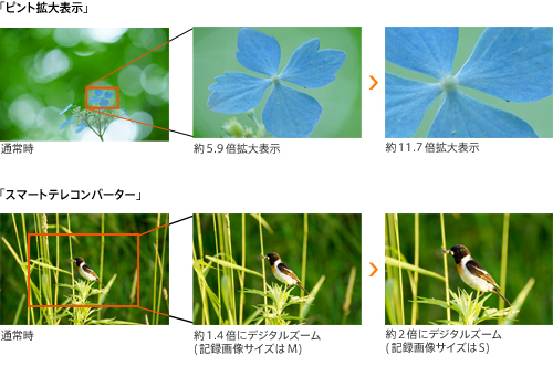 約235万ドットの高解像度有機ELファインダー「XGA OLED Tru-Finder(トゥルーファインダー)」の搭載により、「ピント拡大表示」などもファインダーに表示して、微細なピント調節やピントチェックが可能です。また、画像の中央部分を拡大して記録する「スマートテレコンバーター」も撮影範囲をファインダー内に全画面表示。大きくズームアップしても、被写体のすみずみまでシャープに映し出します。