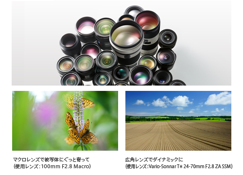個性の異なるレンズを使って表現を自在に変えられるのが、レンズ交換式カメラの魅力。広角レンズで風景をダイナミックにとらえたり、マクロレンズで小さな被写体に迫ったり。さらに描写力に優れた「カールツァイスレンズ」や「Gレンズ」を使って、ハイクオリティーな映像作品を残せます。また、すべてのαレンズでAF機能(*)が働くため、高精度なフォーカシングで、背景ぼけを生かした映像表現が可能です。豊富なαレンズ(Aマウントレンズ)を装着すれば、映像表現の領域がさらに広がります。