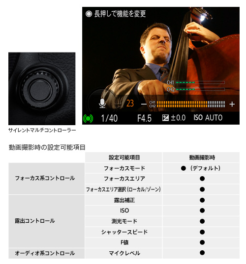 多彩な設定をファンクションボタンとダイヤルで瞬時に直感的に変更できる新インターフェース「サイレントマルチコントローラー」を本体前面に搭載。録画中でもオーディオ録音レベルの調節をはじめ、フォーカスエリア設定、AFモード、露出補正、ISO感度など、多彩なパラメーター調節を静かでスムーズに行えます。