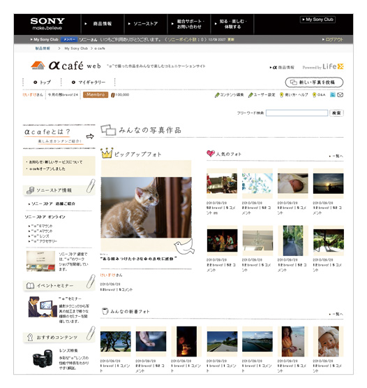 “α”で撮った写真を投稿したり、みんなの作品にコメントを書きこんだり。“α”ユーザーの作品を通して、“α”ユーザー同士でコミュニケーションが楽しめるWEBサイト“αcafe”。“α”ユーザーはもちろん、購入を検討されている方も作品やコメントの閲覧が可能です。