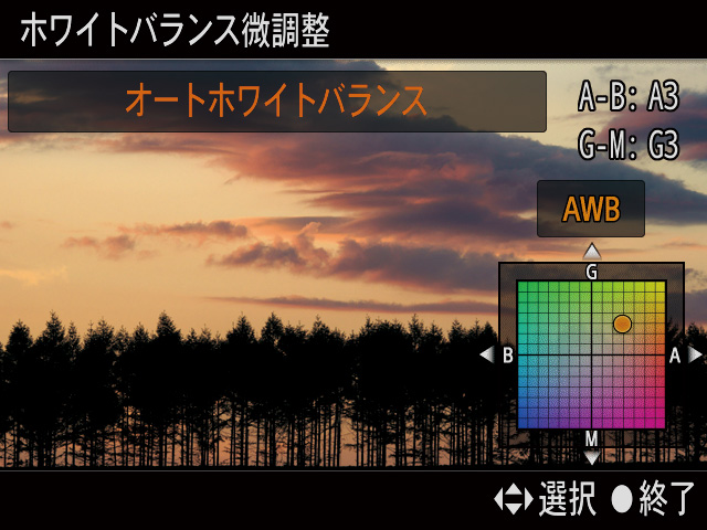 カメラがシーンの光源を自動で判定して、見たイメージに近い自然な色合いを再現する「AWB(オート)」モード。そのほか、「太陽光」「電球」「蛍光灯」などの光源に合わせて選べる6種のプリセットモードが選択できます。さらに、「色温度&カラーフィルター」や色合い微調節画面で、表現に合わせて色彩を細かく調節できます。より正確に白さを表現するため、色合いを登録して呼び出す「カスタム」モードもあります。