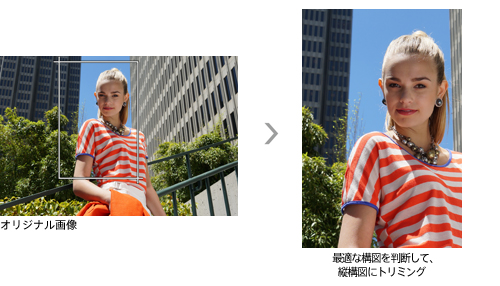 画像を「顔検出」で認識し、バランスのとれた人物画(ポートレート)の構図になるように、カメラが自動で判断して切り出す「オートポートレートフレーミング」機能を搭載。普通に撮ってしまいがちな写真を、より印象的な写真に仕上げ、プロのような構図でポートレートを手軽に撮影できます。また、切り出された画像は「全画素超解像技術」によりオリジナルと同じ解像感を保ちます。オリジナル画像も一緒に保存されるので、自分が取った構図とカメラが判断した構図を比べられ、ポートレート撮影における被写体の切り取りかたの参考にできます。