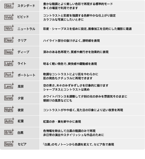 * 「絵画調HDR」「リッチトーンモノクロ」「ソフトフォーカス」「ミニチュア」は静止画撮影時のみ有効。またライブビュー画に反映されません