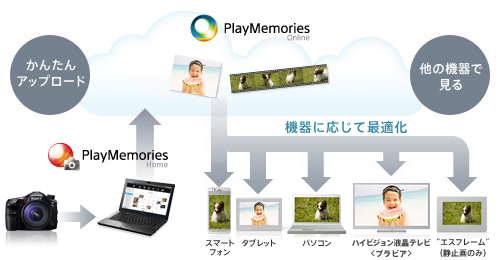 撮った写真や映像をクラウドサービス“PlayMemories Online”にドラッグ&ドロップでアップロードでき、自分の写真や動画を〈ブラビア〉、タブレットなど多彩な機器で見られます。また、かんたん操作でFacebook、Youtube、mixiなどのネットワークサービスにアップロードできます。