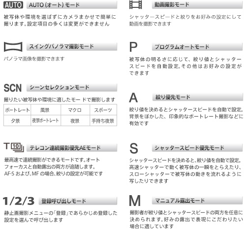 全自動の「AUTO(オート)」のほか、本格的な撮影が楽しめる幅広い撮影モードを搭載。画面中央部を拡大して最高約10コマ/秒(*)の高速連写を実現した「テレコン連続撮影優先AE」をはじめ、シャッタースピードと絞り値を自動設定する「プログラムオート(P)」や「絞り優先(A)」「シャッタースピード優先(S)」「マニュアル(M)」まで、表現意図に合わせて選択できます。さらに、よく使う機能や数値を登録しておけば、すぐに呼び出せる「登録呼び出し(MR)」も設定可能です。