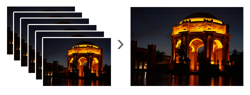 シーンセレクションの「手持ち夜景」モードを選択すれば、高速連写した6枚の画像を重ね合わせて、手ブレやノイズを抑えながら、より鮮やかな夜景を三脚なしで撮影できます。ノイズを増やすことなく高感度撮影が可能です。