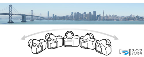 カメラを一振りするだけでパノラマ写真を撮影できる「スイングパノラマ」機能を搭載。シャッターボタンを押してカメラを一振りする間に自動的に高速連写し、1枚のJPEG画像につなぎ合わせます。いままで画面に収まり切らなかった広大な風景や構造物も、1枚のパノラマ写真にできます。