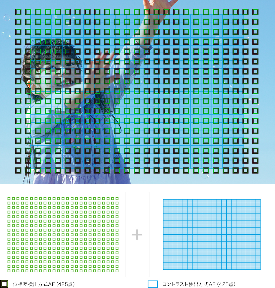 撮像エリアの約84%をカバーする425点の位相差AFセンサーを高密度に配置。ピント合わせが難しいシーンでも、広範囲・高密度に配置されたAFセンサーが被写体を高精度に捉えます。また、画像処理エンジンBIONZ X(ビオンズ エックス)の高速処理で世界最速0.02秒(*)の高速AFを実現。すばやく動く被写体も瞬時に捉えられます。
