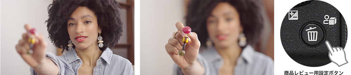 おすすめの商品を紹介するとき、カメラに向けた商品にピントが合わなくて困ったことはありませんか?「商品レビュー用設定ボタン」をひと押しすれば、顔から商品へ、商品から顔へのピント合わせがスムーズに行えます。