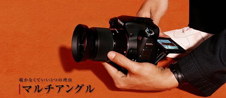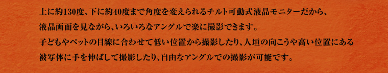 マルチアングル上に約130度、下に約40度まで角度を変えられるチルト可動式液晶モニターだから、液晶画面を見ながら、いろいろなアングルで楽に撮影できます。子供やペットの目線に合わせて低い位置から撮影したり、人垣の向こうや高位置の被写体を手を伸ばして撮影したり、自由なアングルでの撮影が可能です。