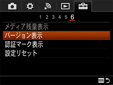 2) [メニュー]→[セットアップ]6→[バージョン表示]を選んでください。