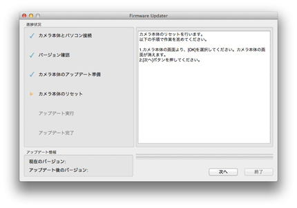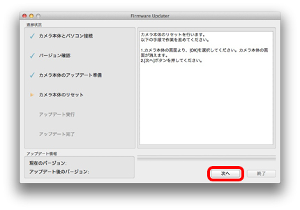 - 1. パソコンとカメラ本体の表示を確認後、「次へ」をクリックすると現在のバージョンとアップデート後のバージョンが表示されます。
