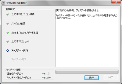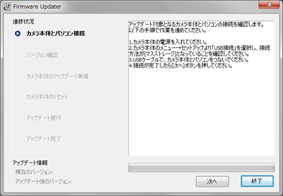 アップデート中は絶対にカメラ本体の電源を切ったり、USB接続を外さないでください。