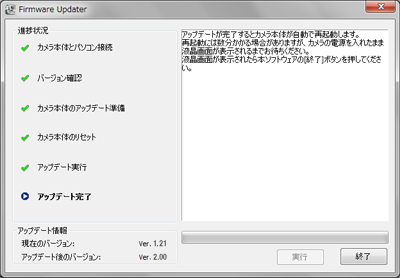 「現在のバージョン」が「Ver.2.00」になっている場合はアップデートする必要がありません。メッセージに従ってUSB接続を解除して「終了」をクリックします。(図6)