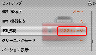 「マスストレージ」以外の設定になっている場合は、「マスストレージ」に設定してください。
