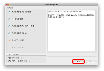 - アップデート中は絶対にカメラ本体の電源を切ったり、USB接続を外さないでください。