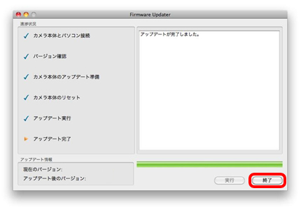 - アップデートが完了すると、下の様な表示に変わります。[終了]ボタンをクリックしUSB接続を外します。