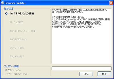 - アップデート中は絶対にカメラ本体の電源を切ったり、USB接続を外さないでください。