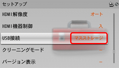 「マスストレージ」以外の設定になっている場合は、「マスストレージ」に設定してください。