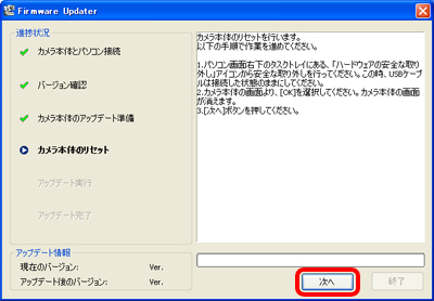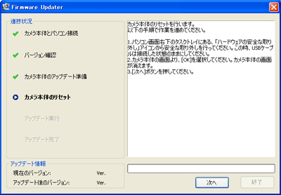 - 1. パソコンとカメラ本体の表示を確認後、「次へ」をクリックすると現在のバージョンとアップデート後のバージョンが表示されます。